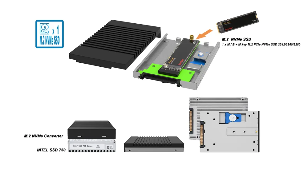 2. M.2 to U.2 Conversion: Converts M.2 NVMe SSDs into a 2.5" U.2 NVMe SSD form factor.