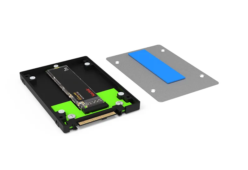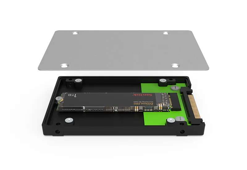 Protects the bare M.2 module in a 2.5" carrier that’s easier to handle, label, inventory, and replace in data-center or field environments. (General industry practice for U.2 serviceability.)