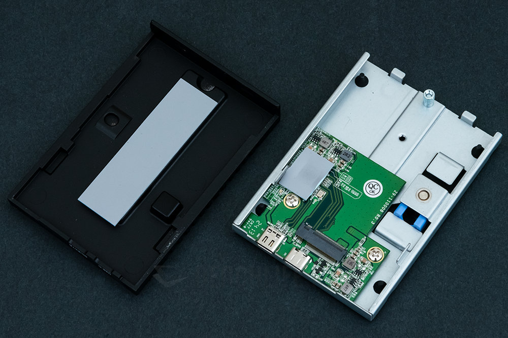 The heat produced by the USB4 controller and the solid-state drive is efficiently dissipated through the relatively thick aluminum alloy upper cover of the UBOX-B4BP. To optimize cooling, thermal pads have been pre-attached at the factory to ensure proper heat transfer from these two heat sources.