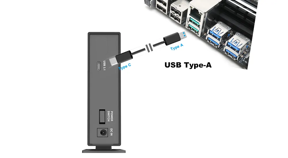 GT1670-B31A ensures broad interface support, accommodating host computers equipped with either USB Type-A port. This feature provides users with extensive connectivity options. Regardless of your computer's USB interface, the docking station seamlessly integrates with it, guaranteeing smooth and efficient data transfer processes. Whether your system is the latest model with USB Type-A, our docking station ensures complete compatibility, delivering a versatile solution for your data storage needs.